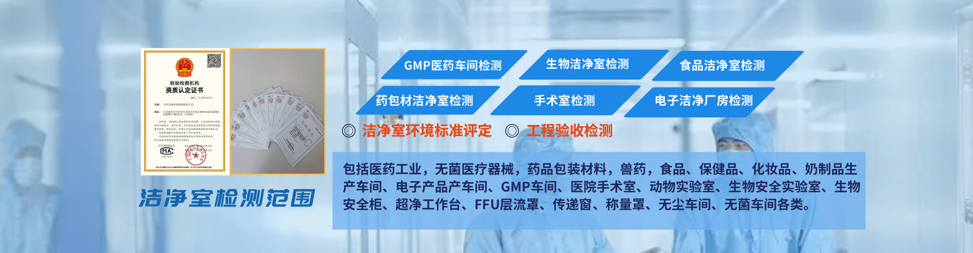 主營(yíng)業(yè)務(wù):凈化車(chē)間檢測(cè) 三方潔凈室檢測(cè) 計(jì)算機(jī)化系統(tǒng)驗(yàn)證 潔凈室檢測(cè) gsp溫濕度驗(yàn)證 高效過(guò)濾器檢測(cè) 壓縮空氣檢測(cè)  純化水檢測(cè) 潔凈度檢測(cè)